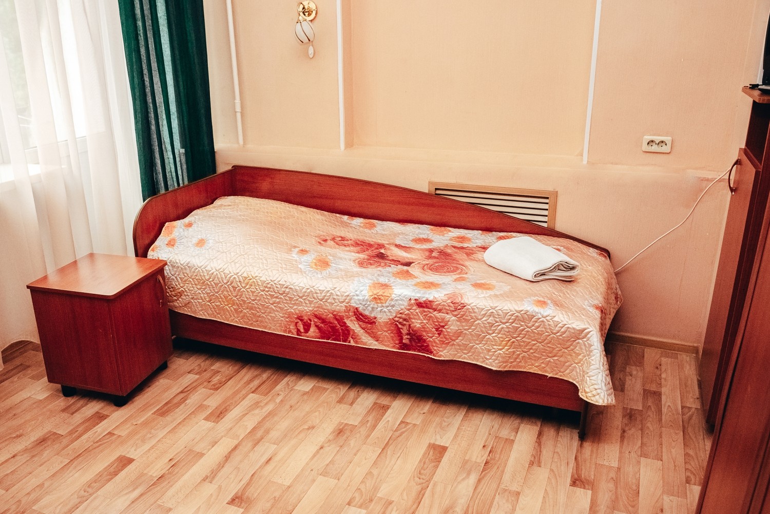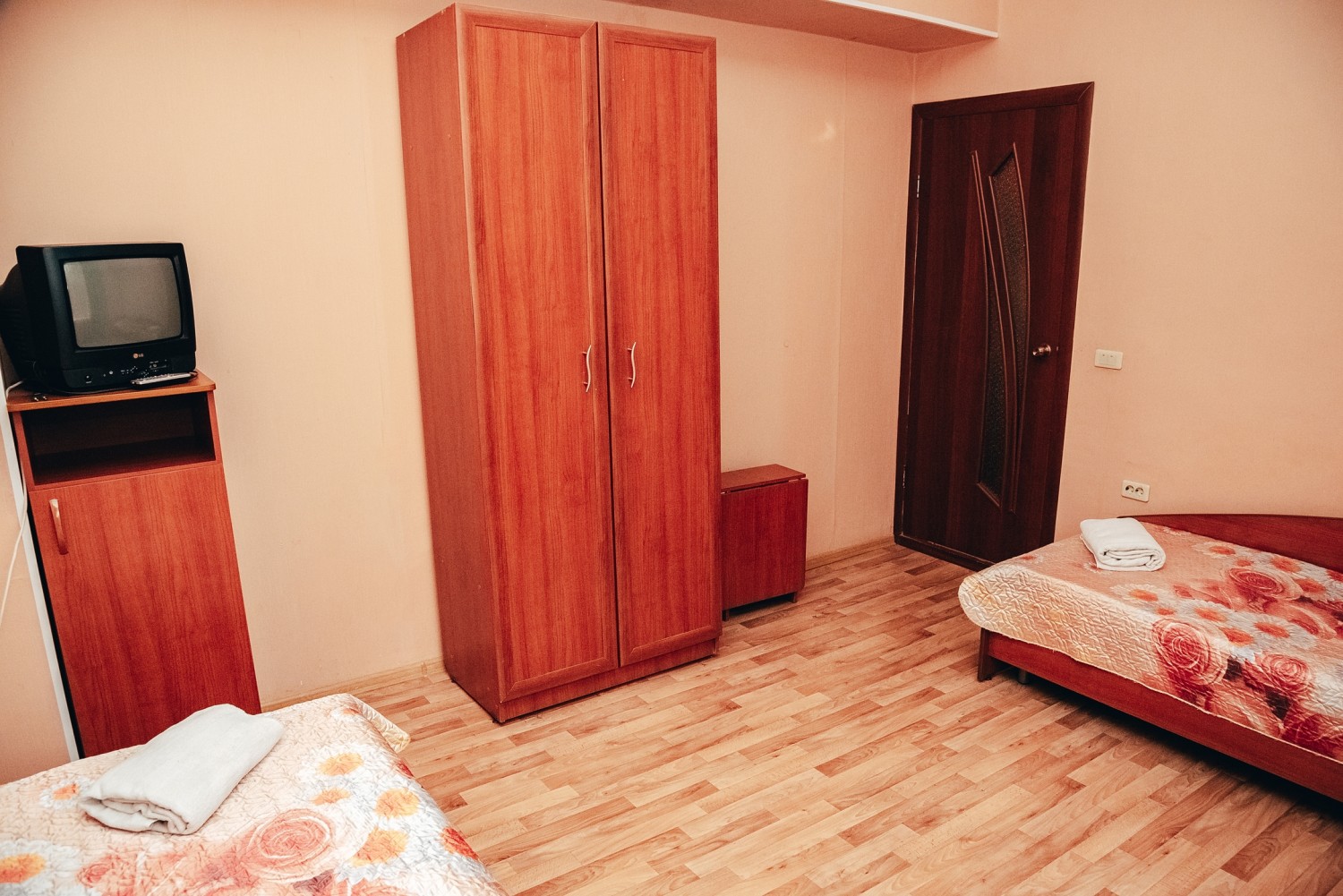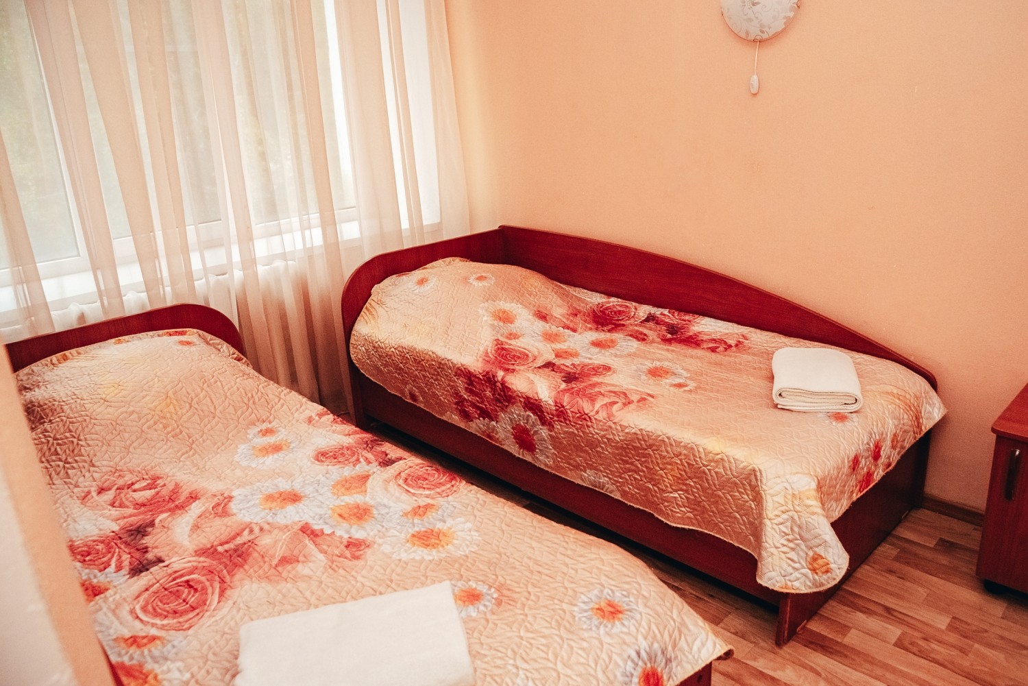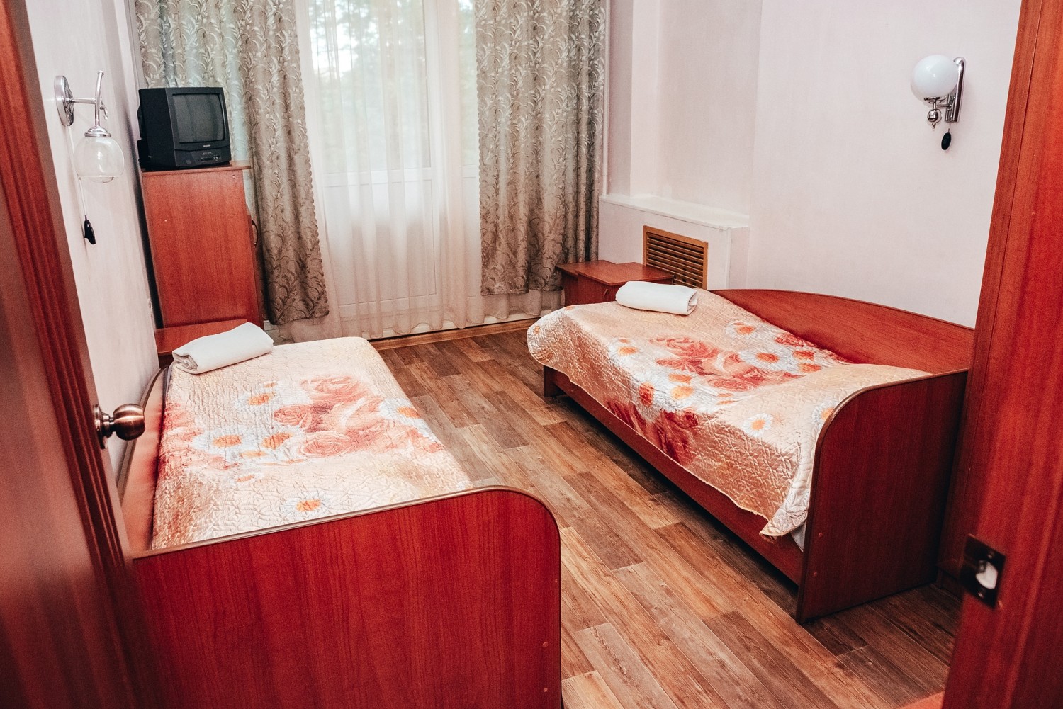 В номере: две односпальные кровати, телевизор, 2 кресла, журнальный столик, тумбочка, встроенный платяной шкаф, радиоточка, раковина для умывания. Душевая и сан. узел находятся на этаже.