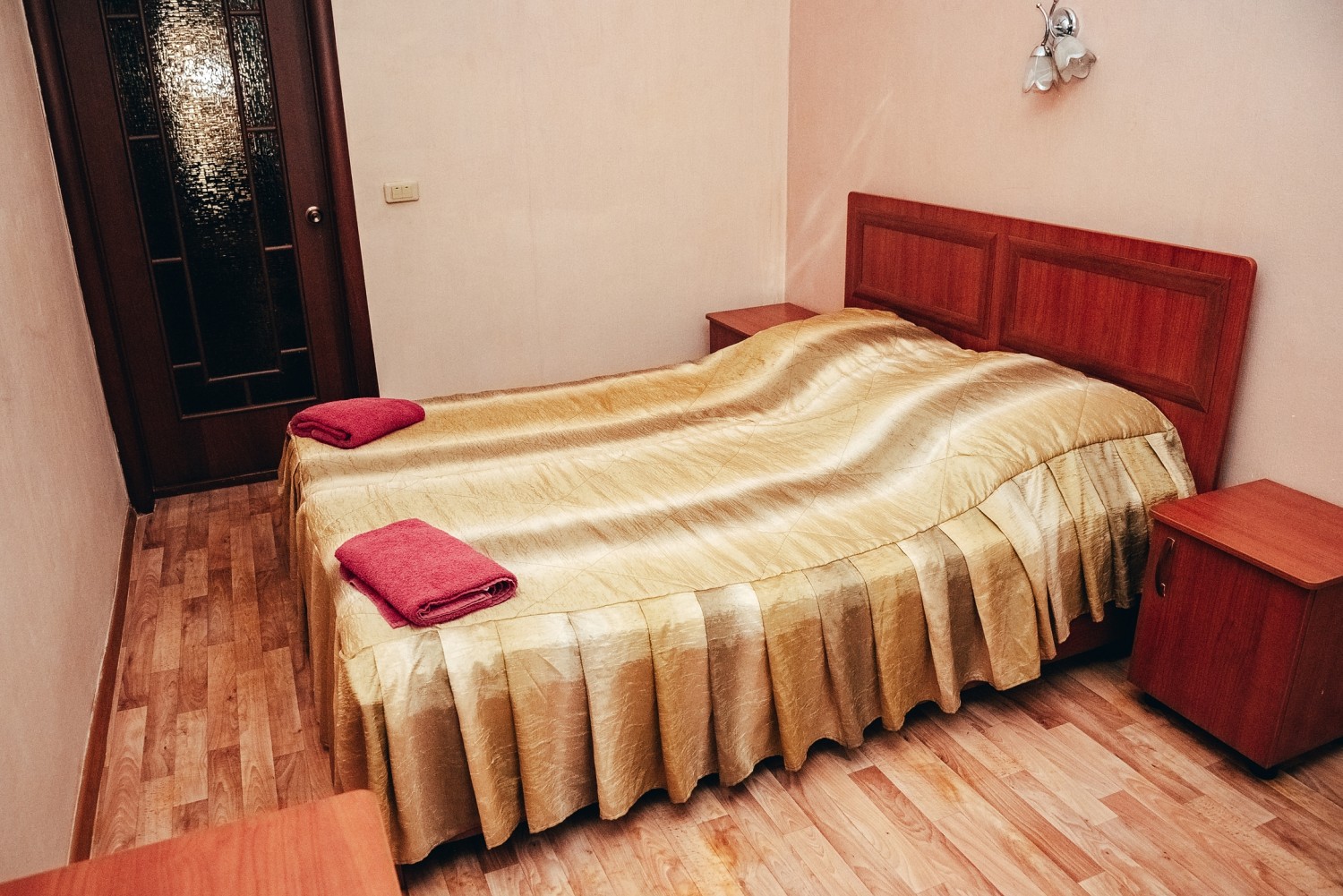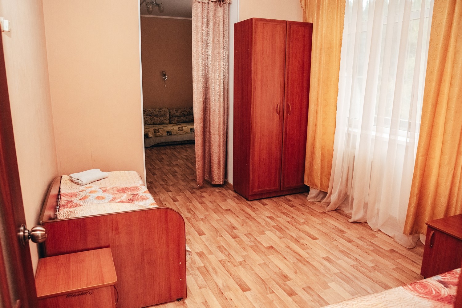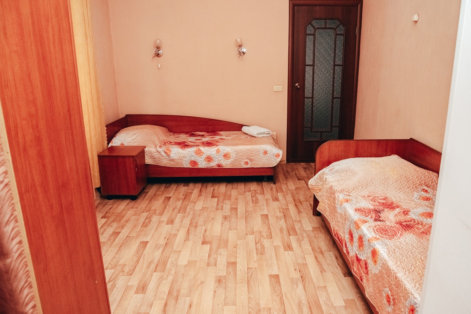 В номере: две односпальные кровати, телевизор, 2 кресла, журнальный столик, тумбочка, встроенный платяной шкаф, радиоточка, раковина для умывания. Душевая и сан. узел находятся на этаже.
